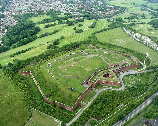 A closer view of Fort Purbrook. The buildings in the distance (centre), beyond