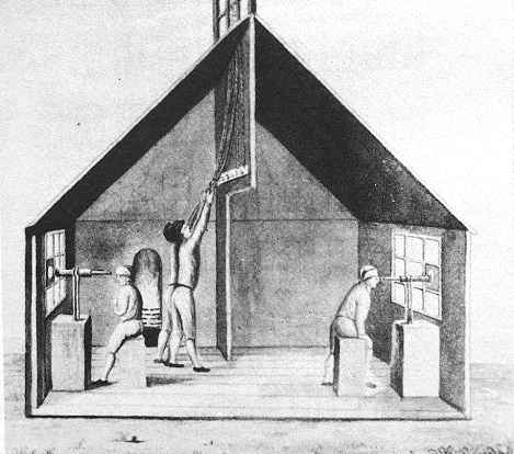 men at each station. Two men watched through telescopes - called